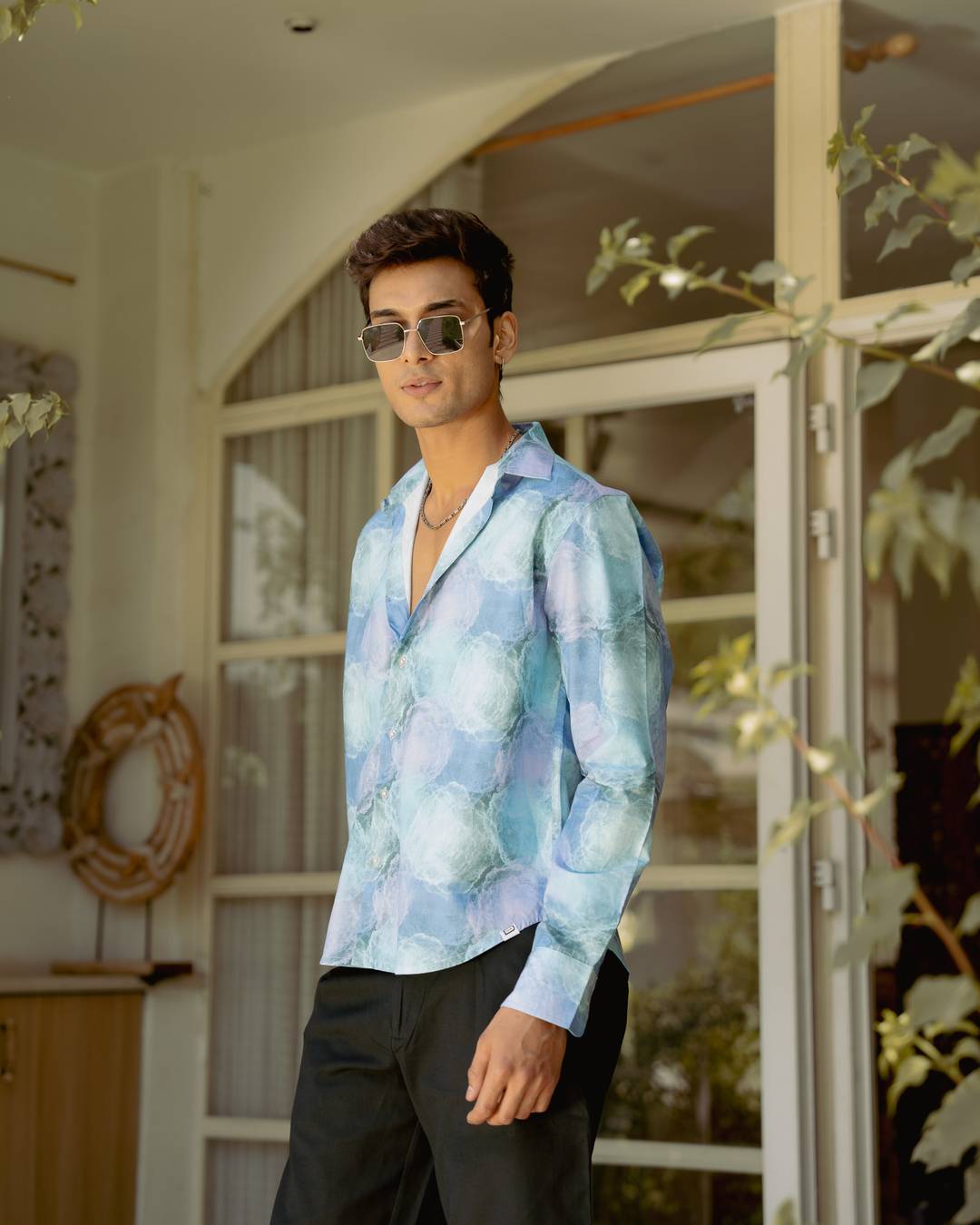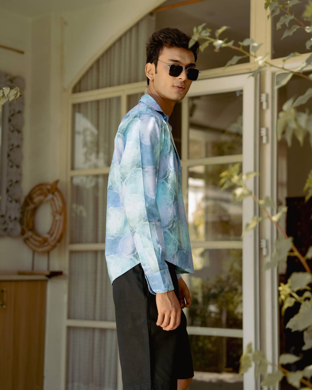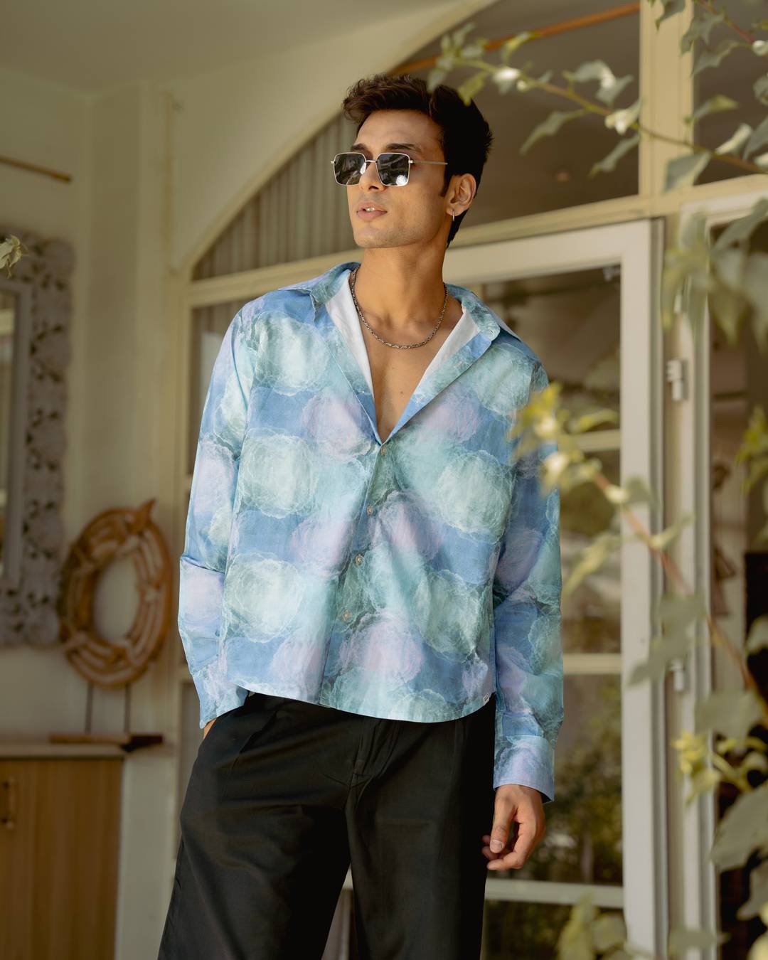 Soothing tie-dye swirls in aqua and lavender flow across lightweight Cotton fabric for a relaxed, breezy look. Perfect for Beach strolls, meditation sessions, or chill dinner evenings.