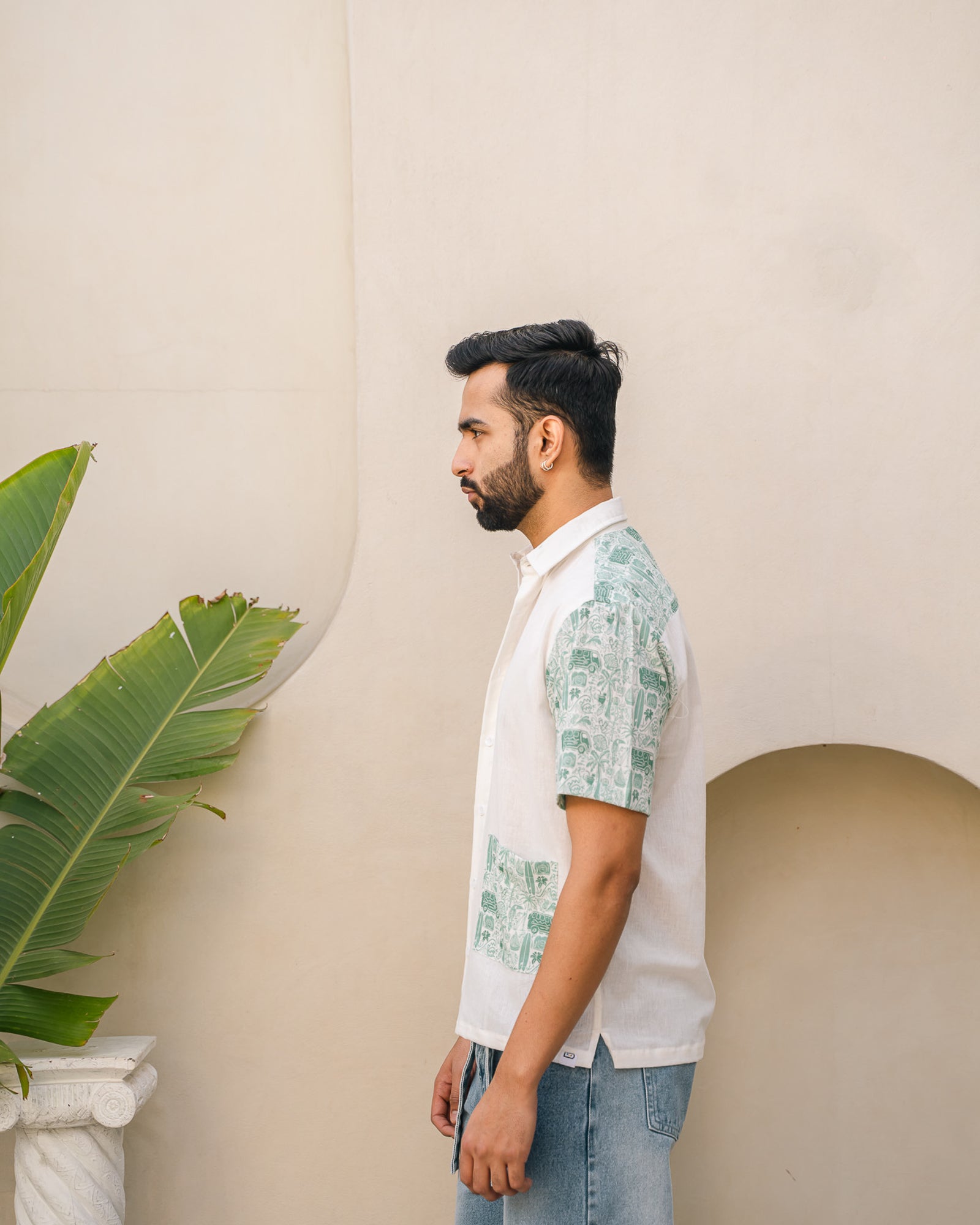 Elevate your summer wardrobe with this flax fabric ,a regular beach inspired print shirt. Perfect for casual outings or casual brunches, style it with linen trousers and loafers for a breezy, sophisticated look.