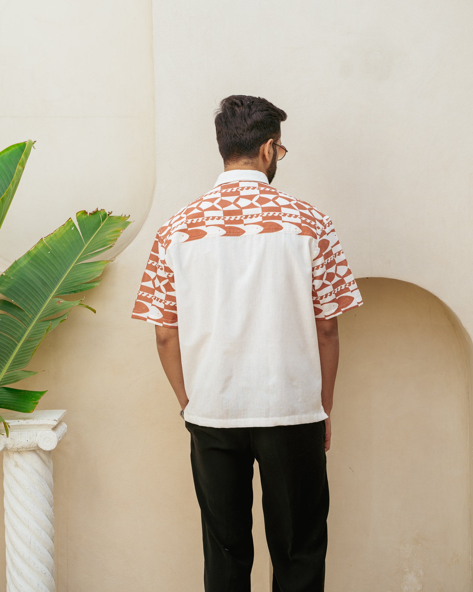 Elegant white shirt with earthy-toned print. Perfect for casual outings, summer brunches, semi-formal office wear, or travel.