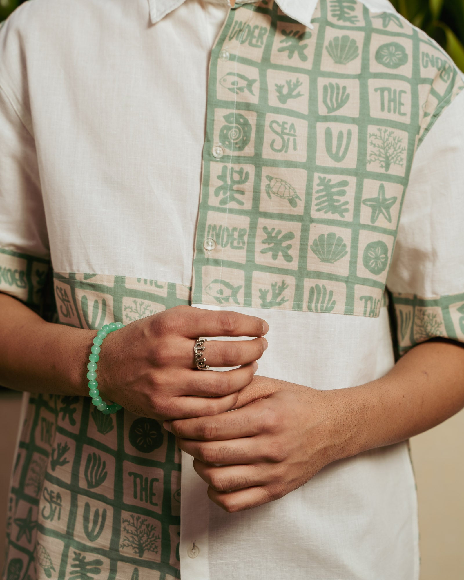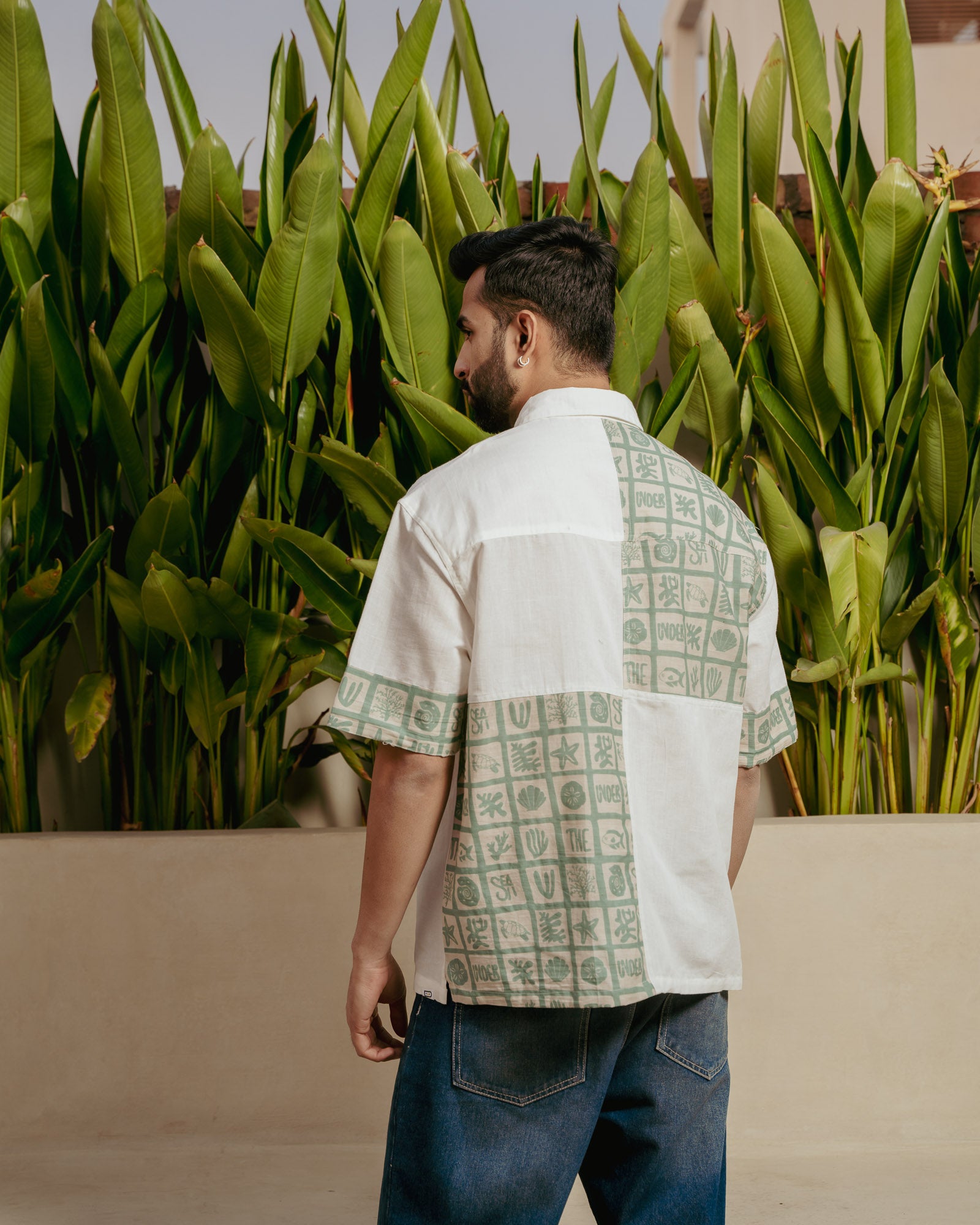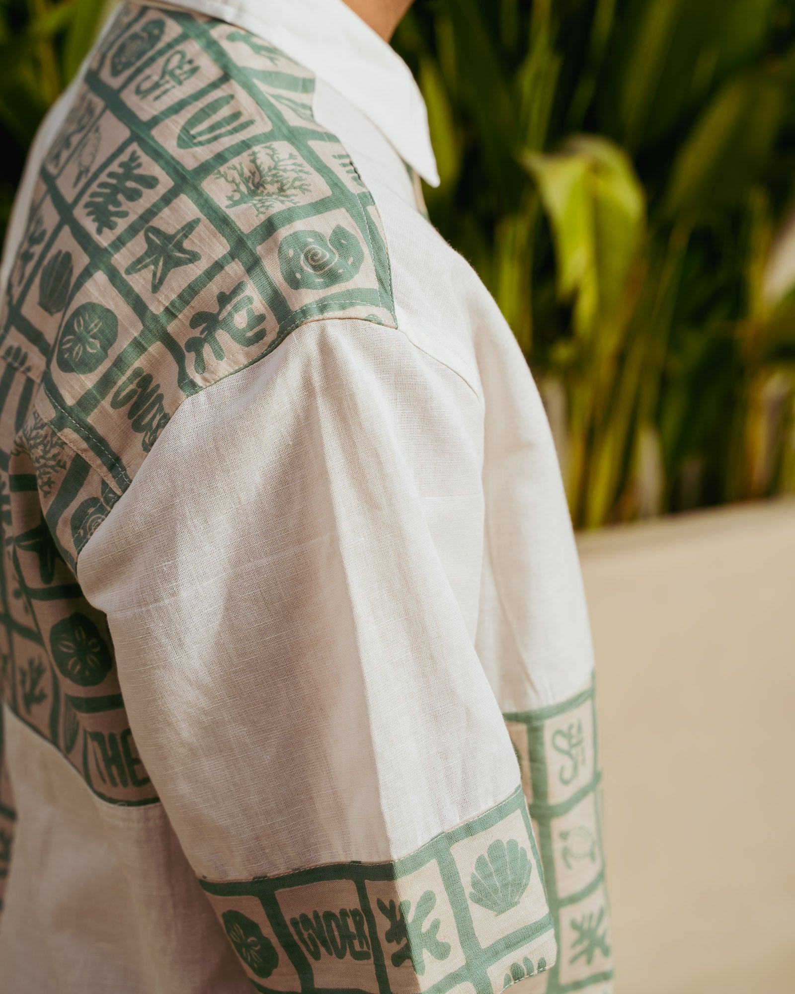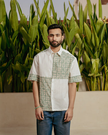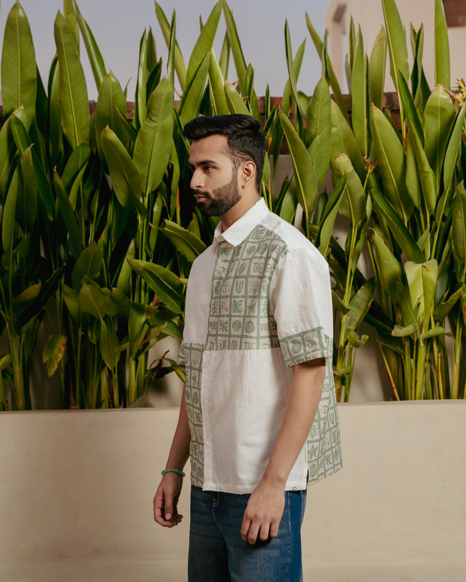 Elegant white linen shirt with geometric graphics. Perfect for casual outings, summer brunches, semi-formal office wear, or travel, combines breathable comfort with stylish, modern aesthetics.